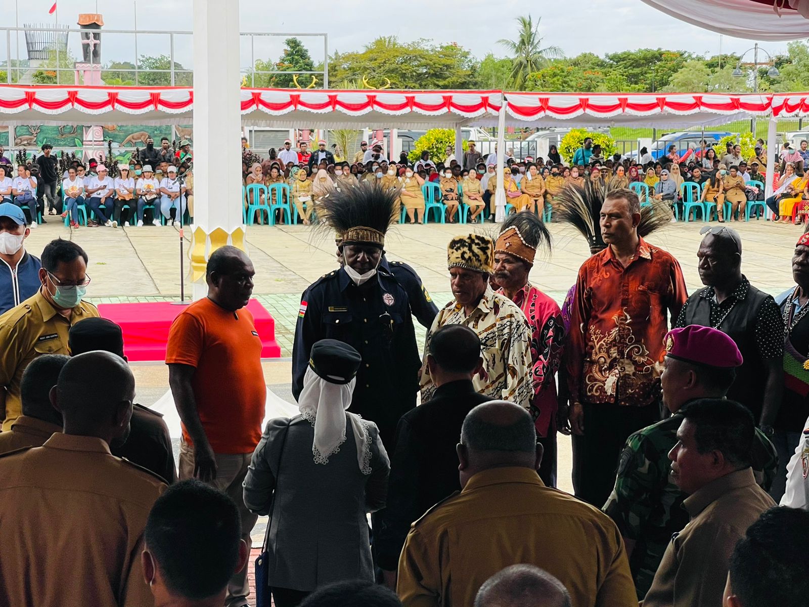 Rakyat Today.Id _ Merauke Papua – Bupati Merauke Romanus Mbaraka di dampingi Wakil Bupati Merauke, H. Riduwan, unsur forum komunikasi pimpinan daerah (forkopimda), pimpinan OPD serta para kepala bagian , ASN maupun tenaga honorer di lingkungan Pemkab Merauke serta masyarakat melakukan pawai dalam rangka menyambut pengesahan DOB Provinsi Papua Selatan ( PPS ), kedatangan Bupati Merauke dan tim di sambut dengan pembetangan benderah merah putih di Bandara Mopah Merauke dan di lanjutkan pawai hingga finis di halaman kantor Bupati Merauke. Senin (11/7/2022).