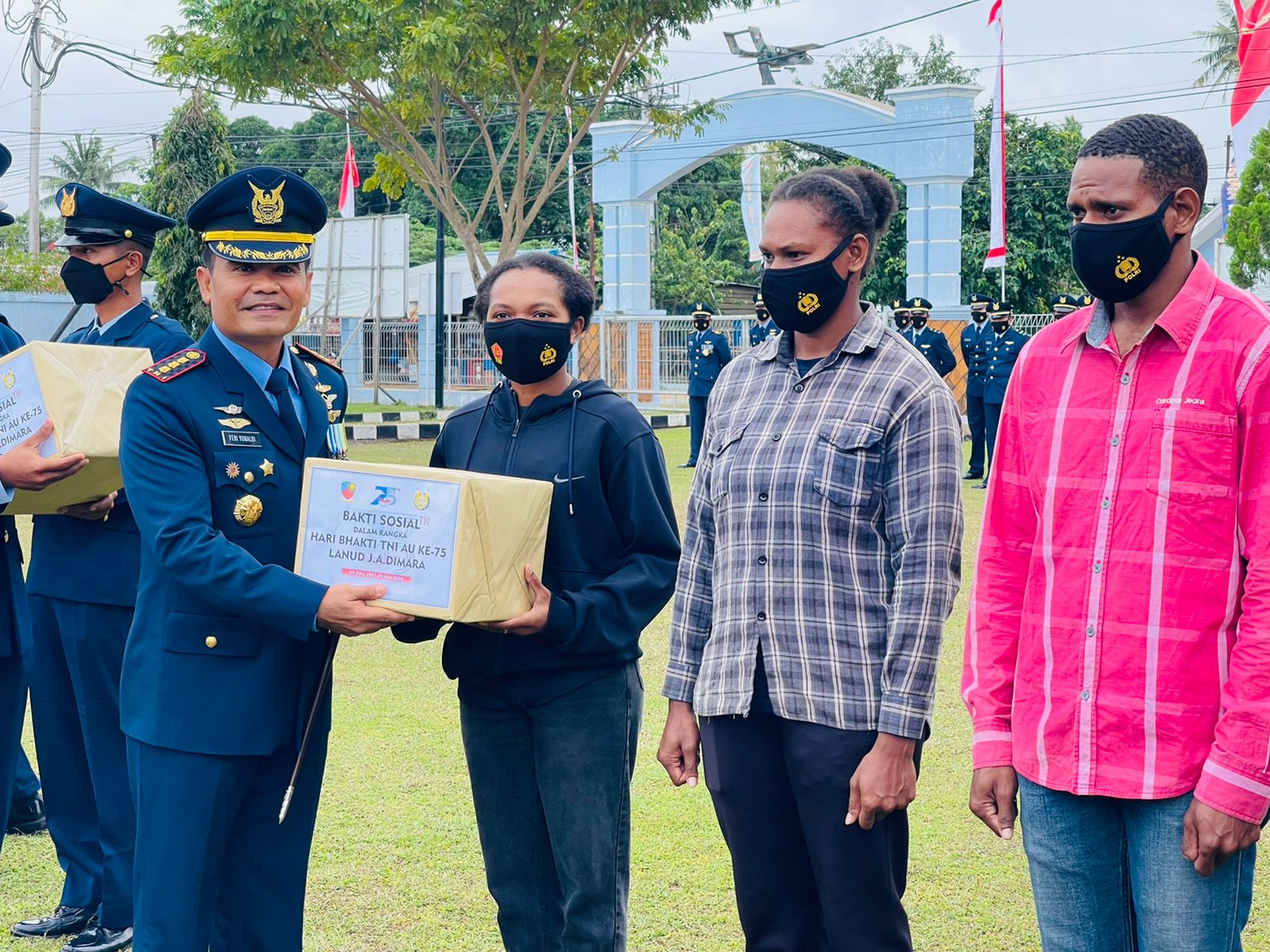 Usai upacara, Danlanud menyerahkan bingkisan kepada masyarakat yang bekerja di lingkungan Lanud JA Dimara dan perwakilan atlet voli Klub Rajawali binaan Lanud JA Dimara. (AR )