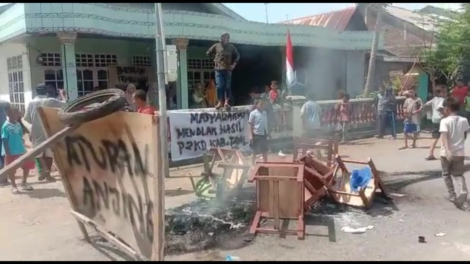 Massa menggeruduk Kantor Desa Takalar dengan membawa berbagai poster serta membakar berbagai fasilitas kantor desa hingga jalan akses jalan poros lintas Kabupaten di tutup.